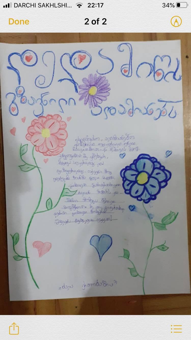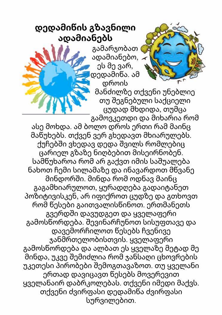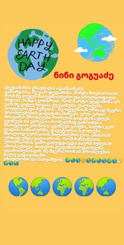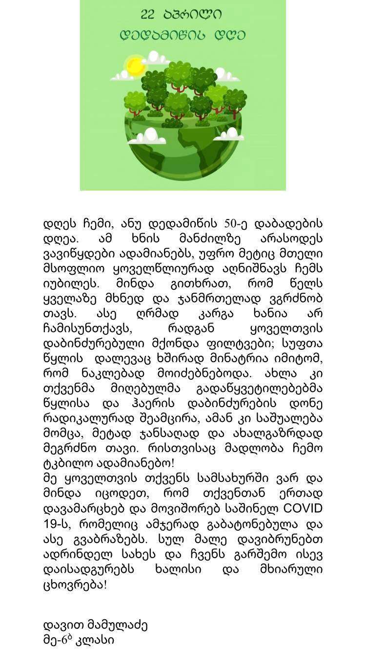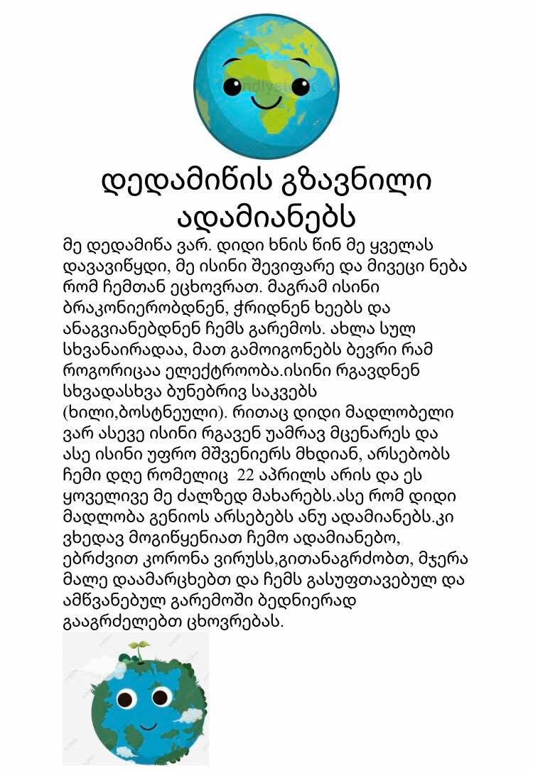 ძალიან გონიერმა და კრეატიულმა მოსწავლეებმა ამ დღეს დედამიწის როლი მოირგეს და ძალიან თბილი , სამადლობელო წერილი მისწერეს ადამიანებს.
