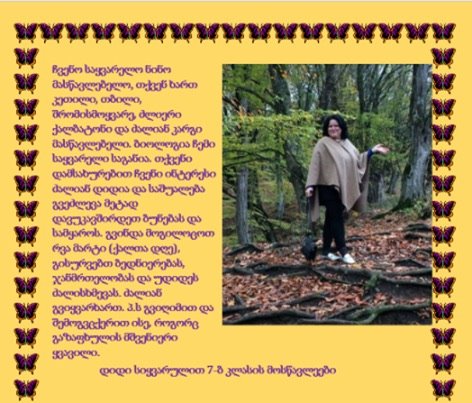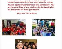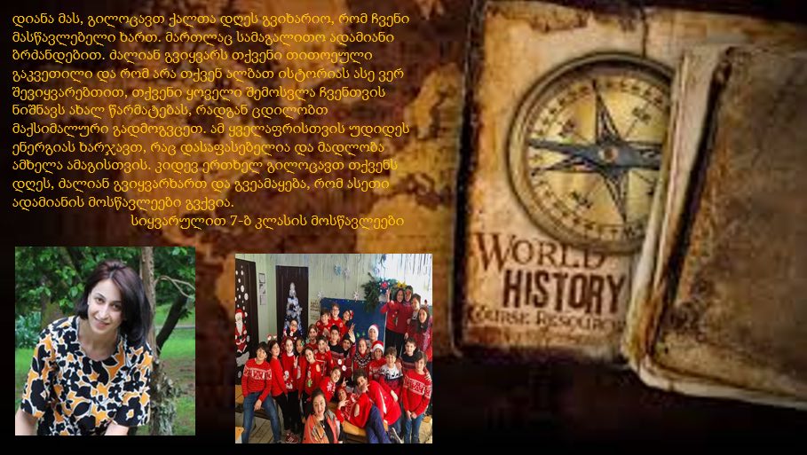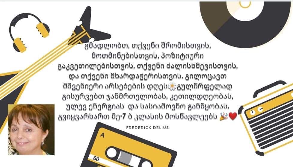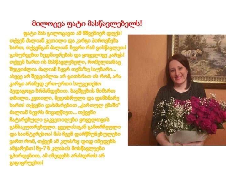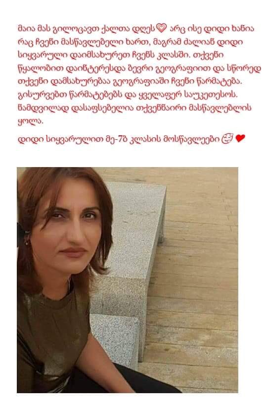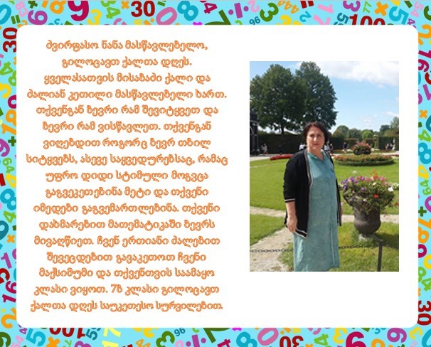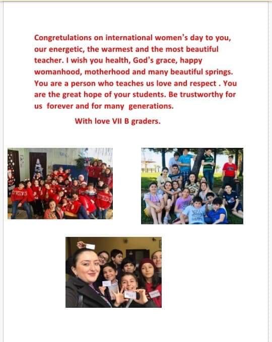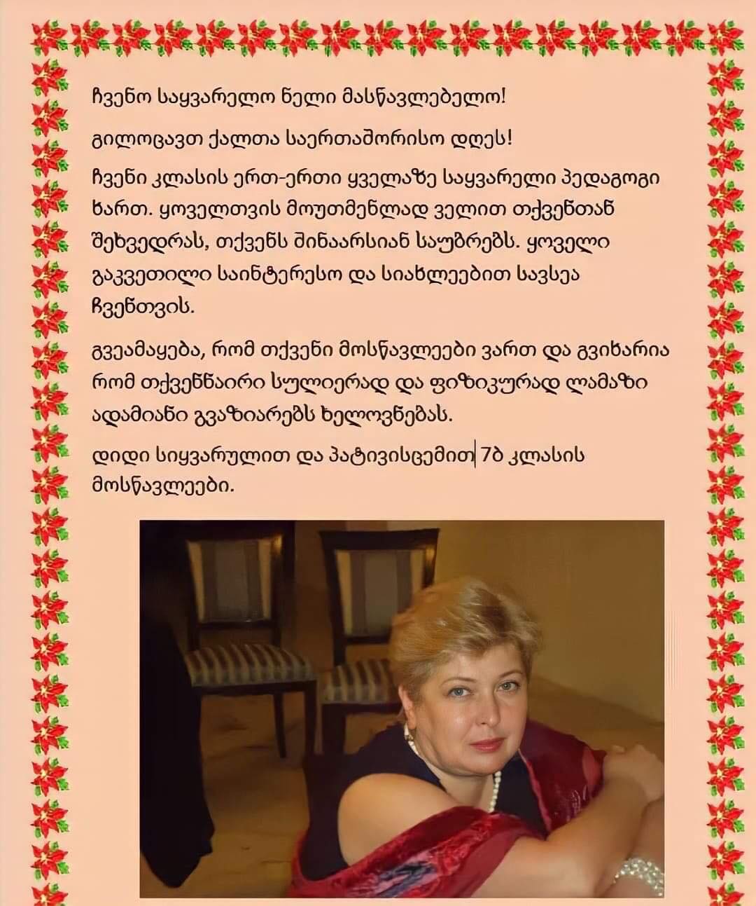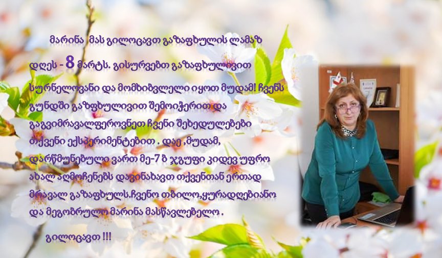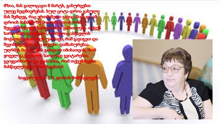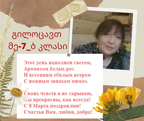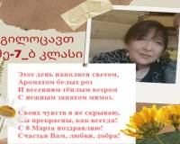 გაზაფხულდა, დღეს 8 მარტია, ყველაზე მშვენიერი არსებების დღე. სსიპ-ქალაქ ბათუმის N8 საჯარო სკოლის მე-7 ბ კლასელები (დამრიგებელი ია ბლაგიძე), სპეციალურად მომზადებული მისალოცი ბარათებით, დიდი სიყვარულითა და პატივისცემით, ულოცავენ, მათი საგნის მასწავლებლებს, ქალთა საერთაშორისო დღეს.