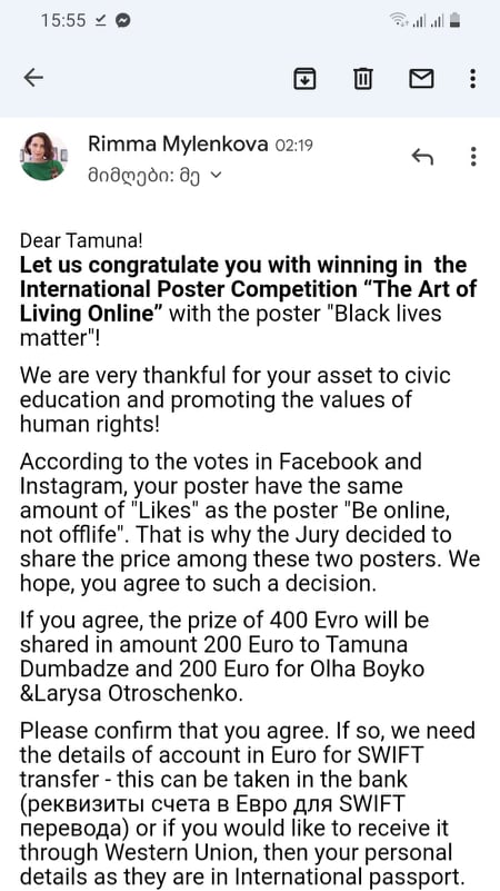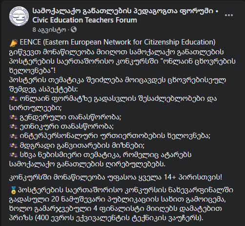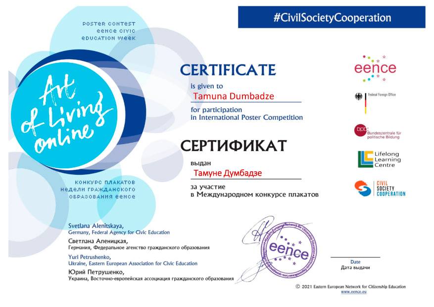 სსიპ-ქალაქ ბათუმის N8 საჯარო სკოლის მე-11 ,,ე" კლასის მოსწავლე თამუნა დუმბაძემ სამოქალაქო განათლების პოსტერების საერთაშორისო კონკურსში გაიმარჯვა.