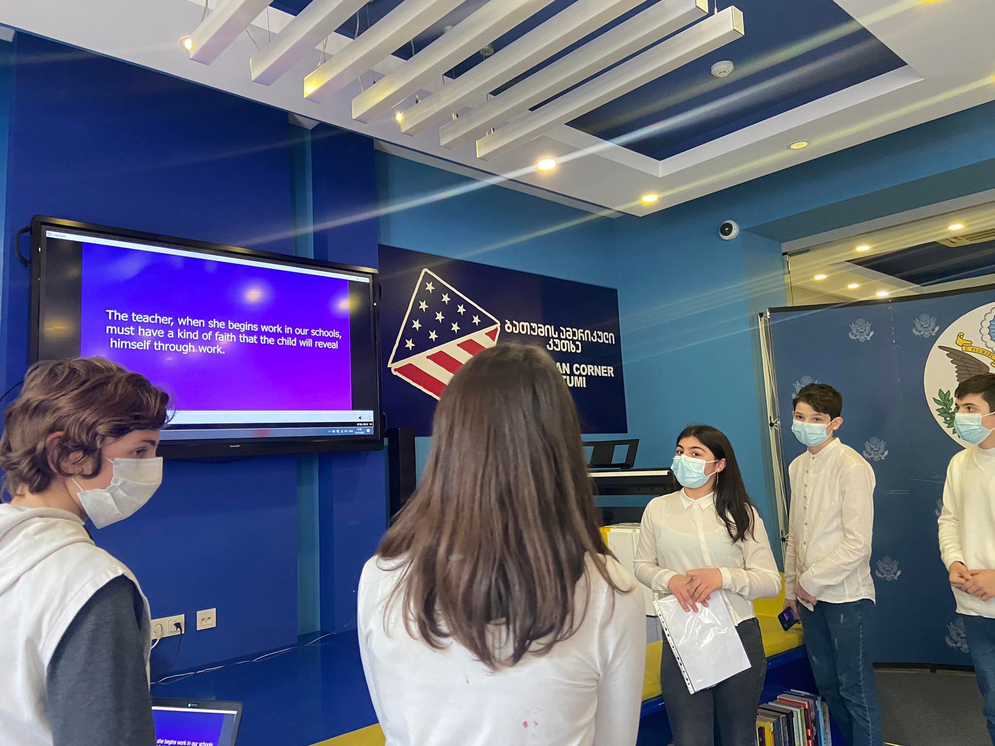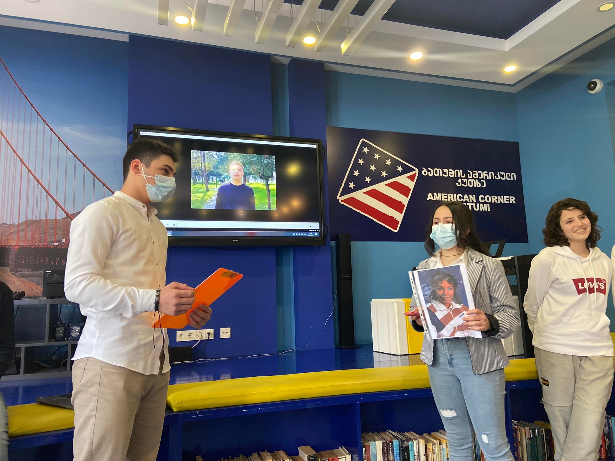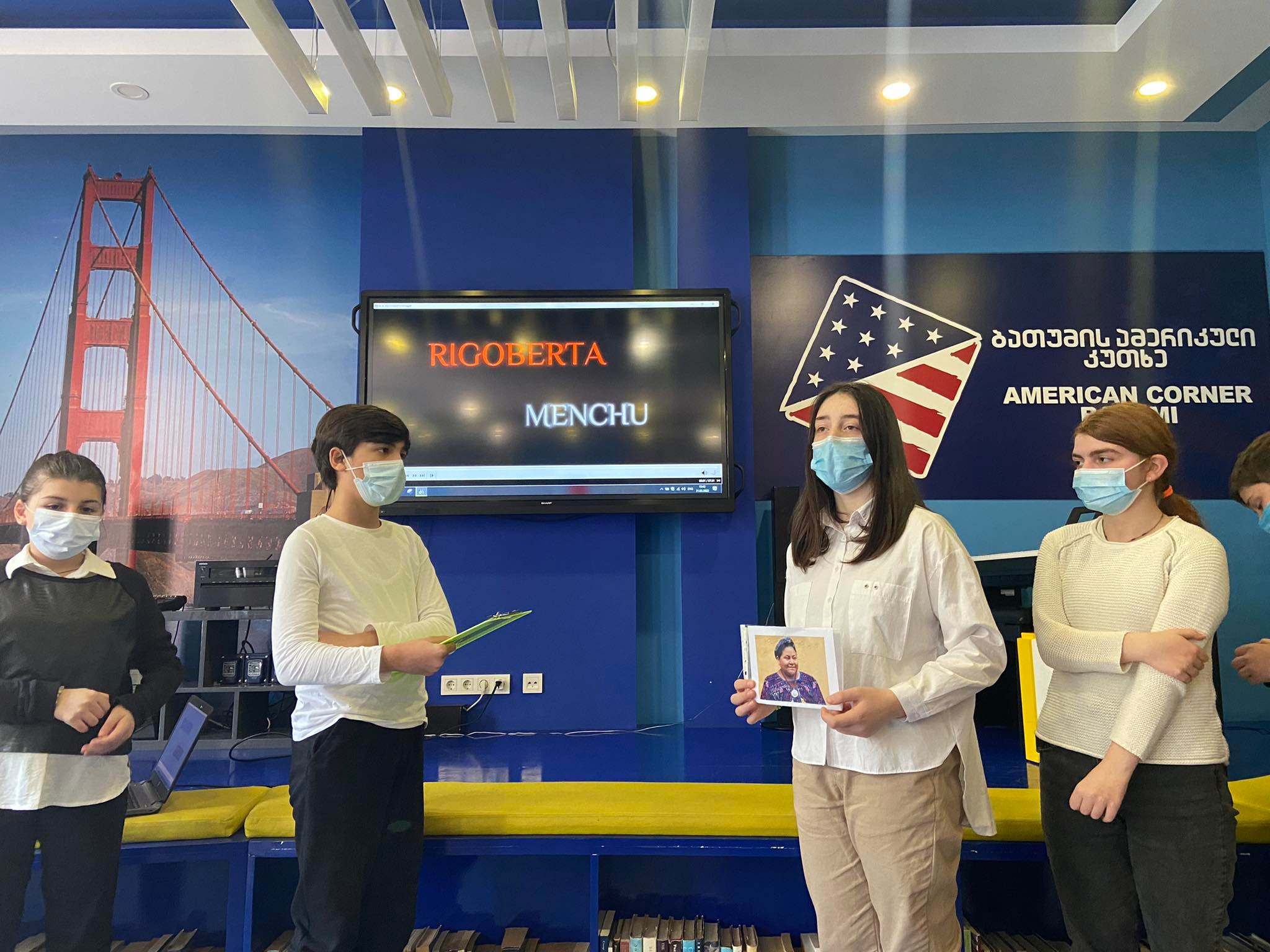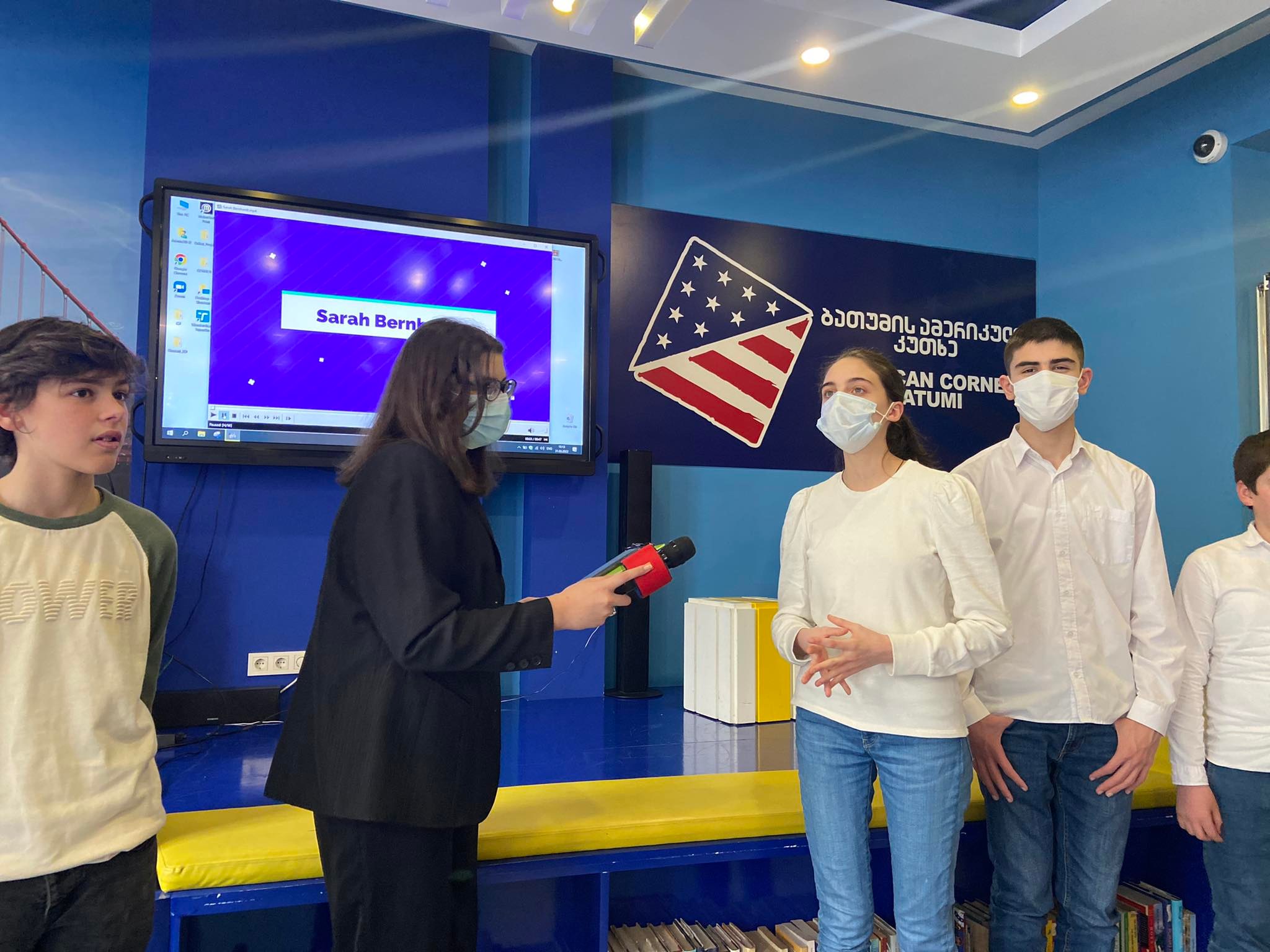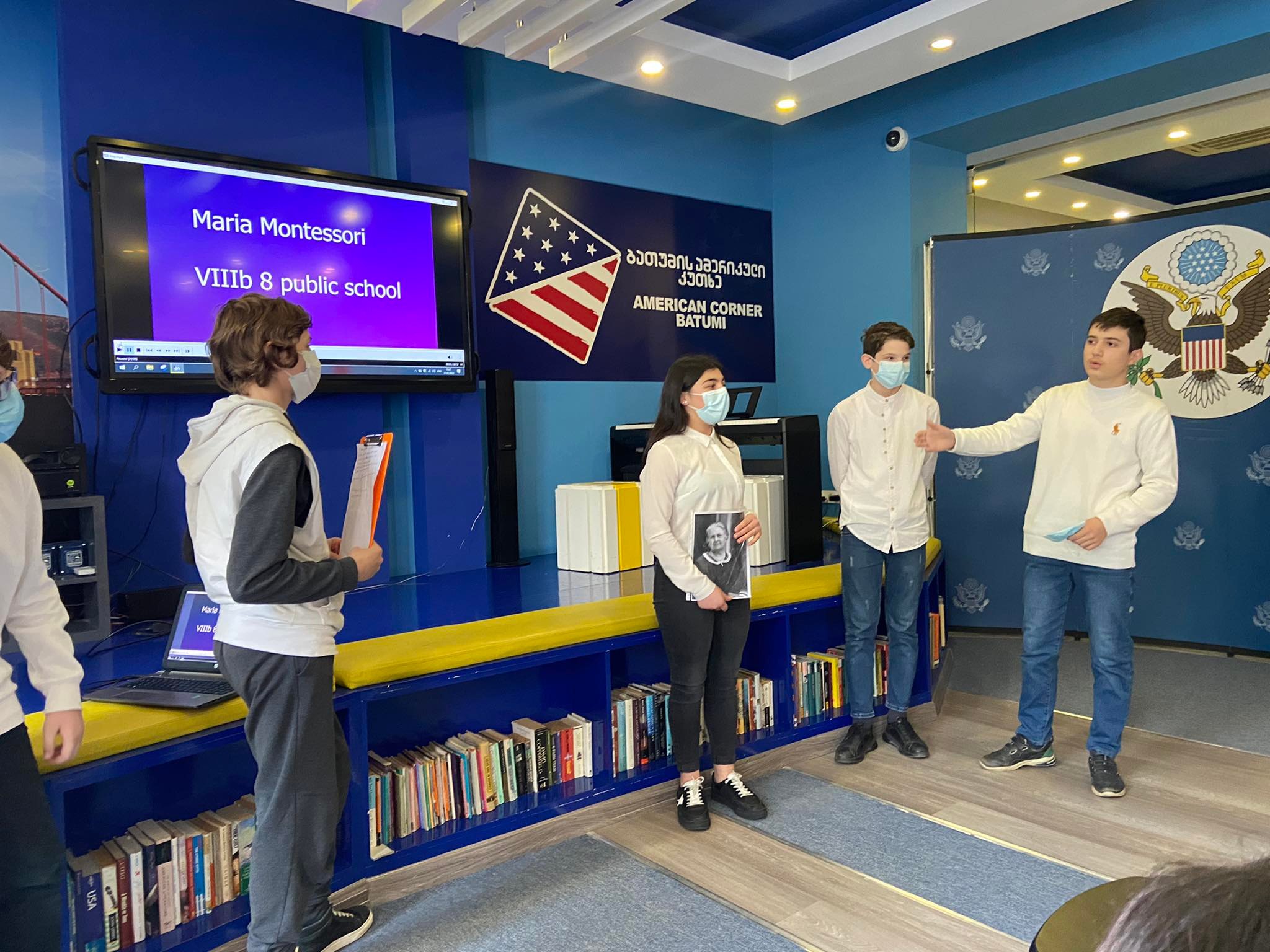 Grade VIIIb of Batumi Public School N8 joined the theme of March in the American Corner. Teenagers presented video projects on the faces of women who had quite an interesting and impressive life story. The projects were presented in a video,where students told us about women’s achievements using photos and relevant videos. An important part of the project was the dialogue between the journalist and the main character (with the participation of students). Stories were about Diana Golden -Skier with one leg Maria Montessori -Educator Rigoberta Menchu -Activist Sara Bernhardt -Actress