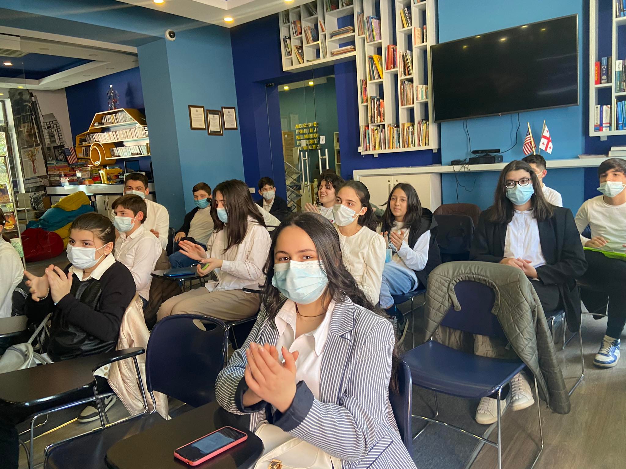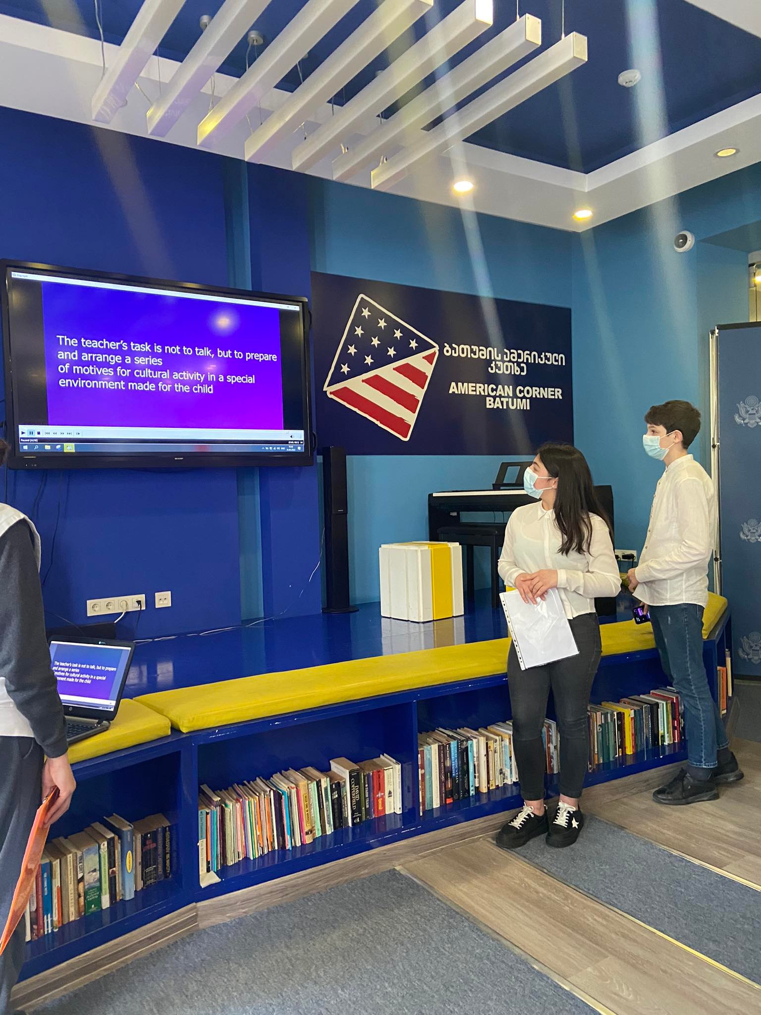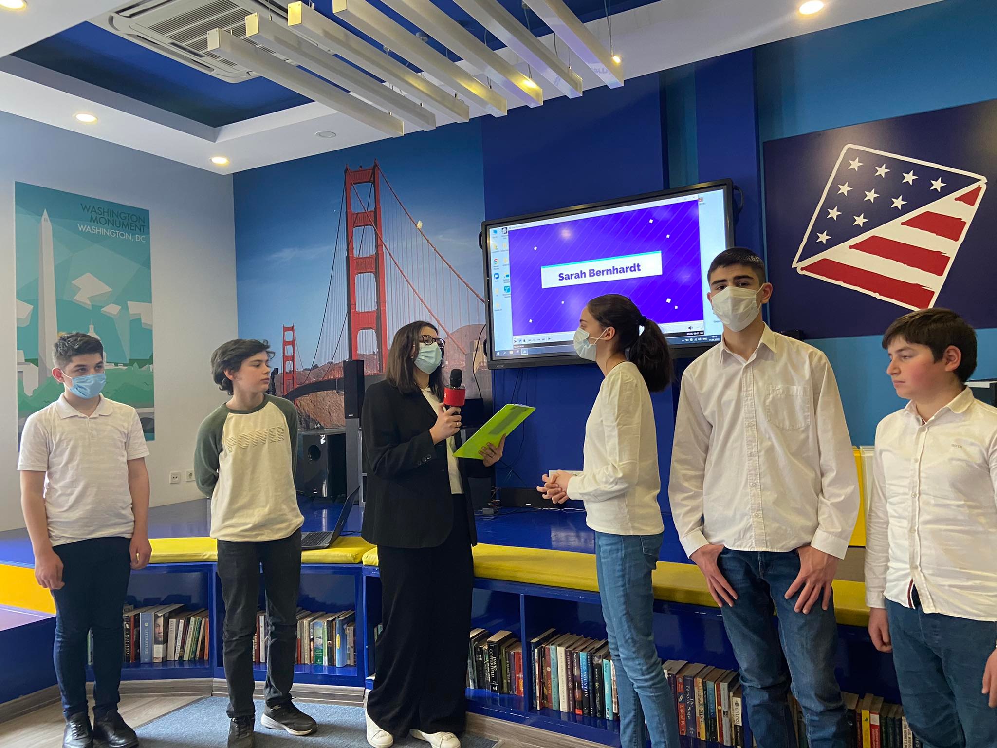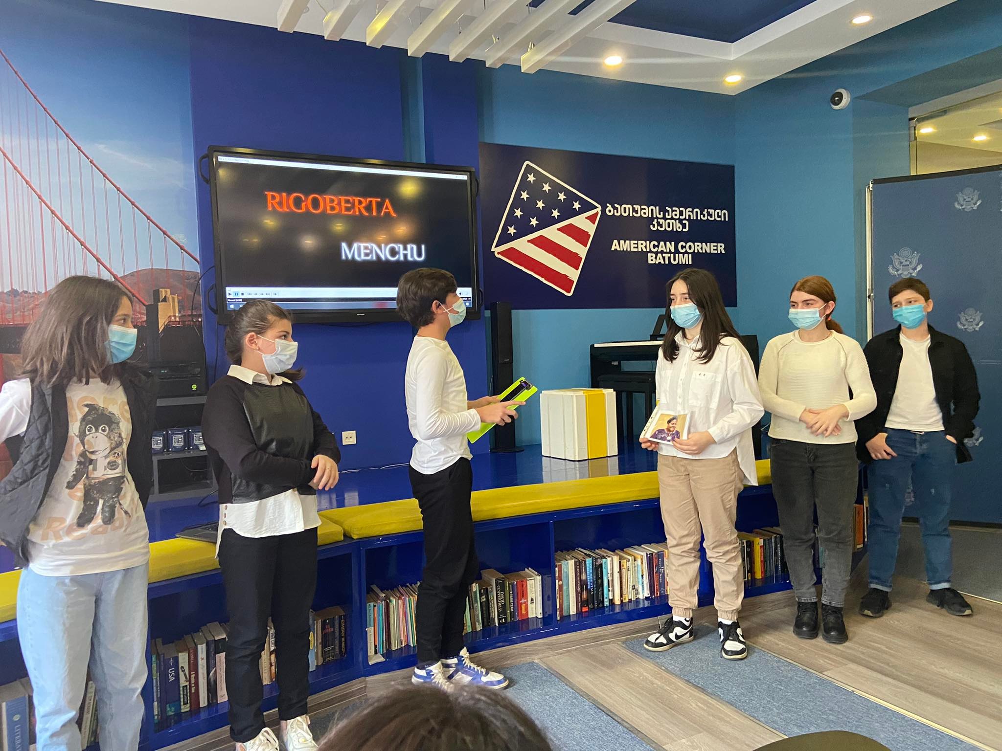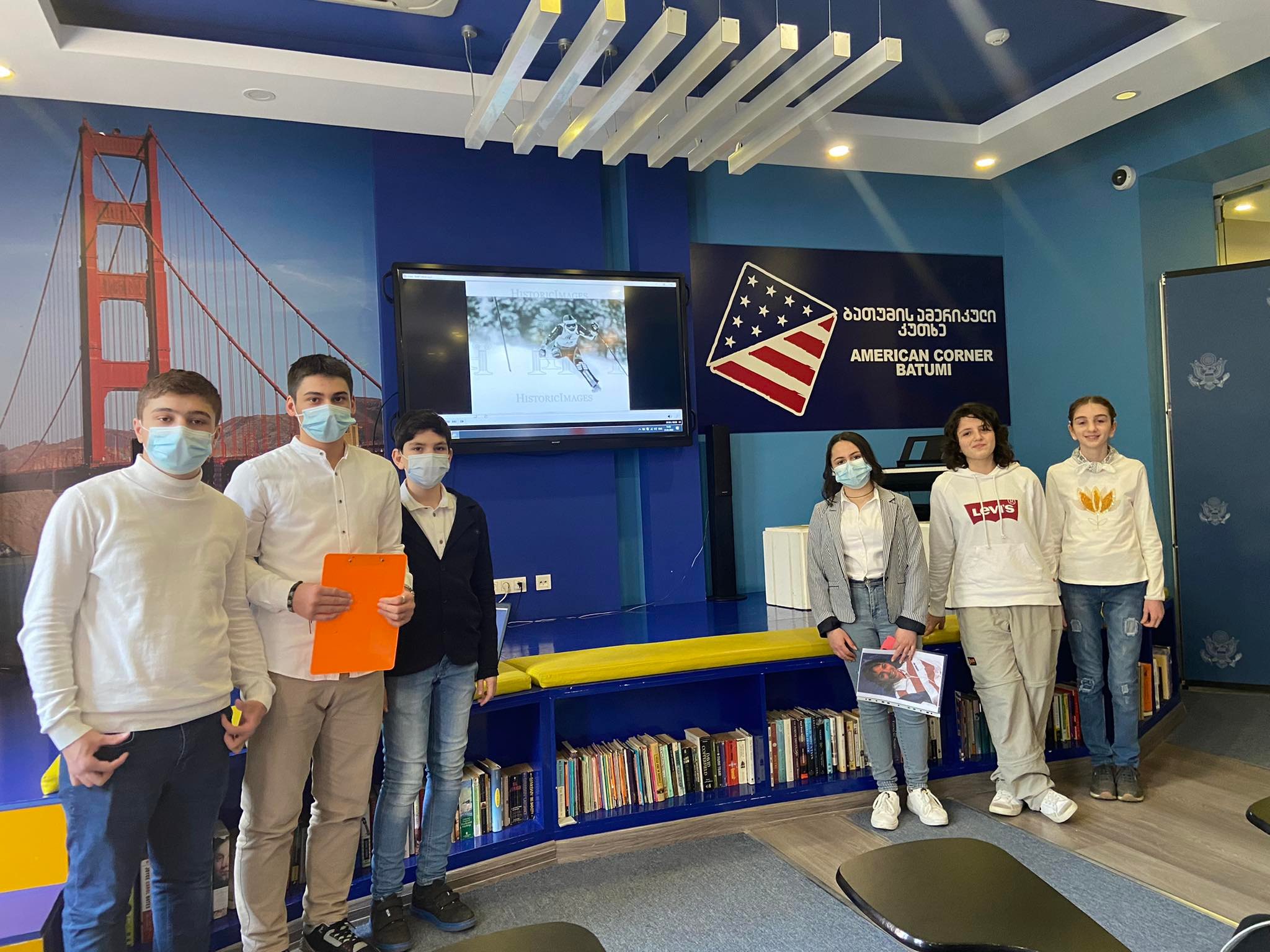 Grade VIIIb of Batumi Public School N8 joined the theme of March in the American Corner. Teenagers presented video projects on the faces of women who had quite an interesting and impressive life story. The projects were presented in a video,where students told us about women’s achievements using photos and relevant videos. An important part of the project was the dialogue between the journalist and the main character (with the participation of students). Stories were about Diana Golden -Skier with one leg Maria Montessori -Educator Rigoberta Menchu -Activist Sara Bernhardt -Actress