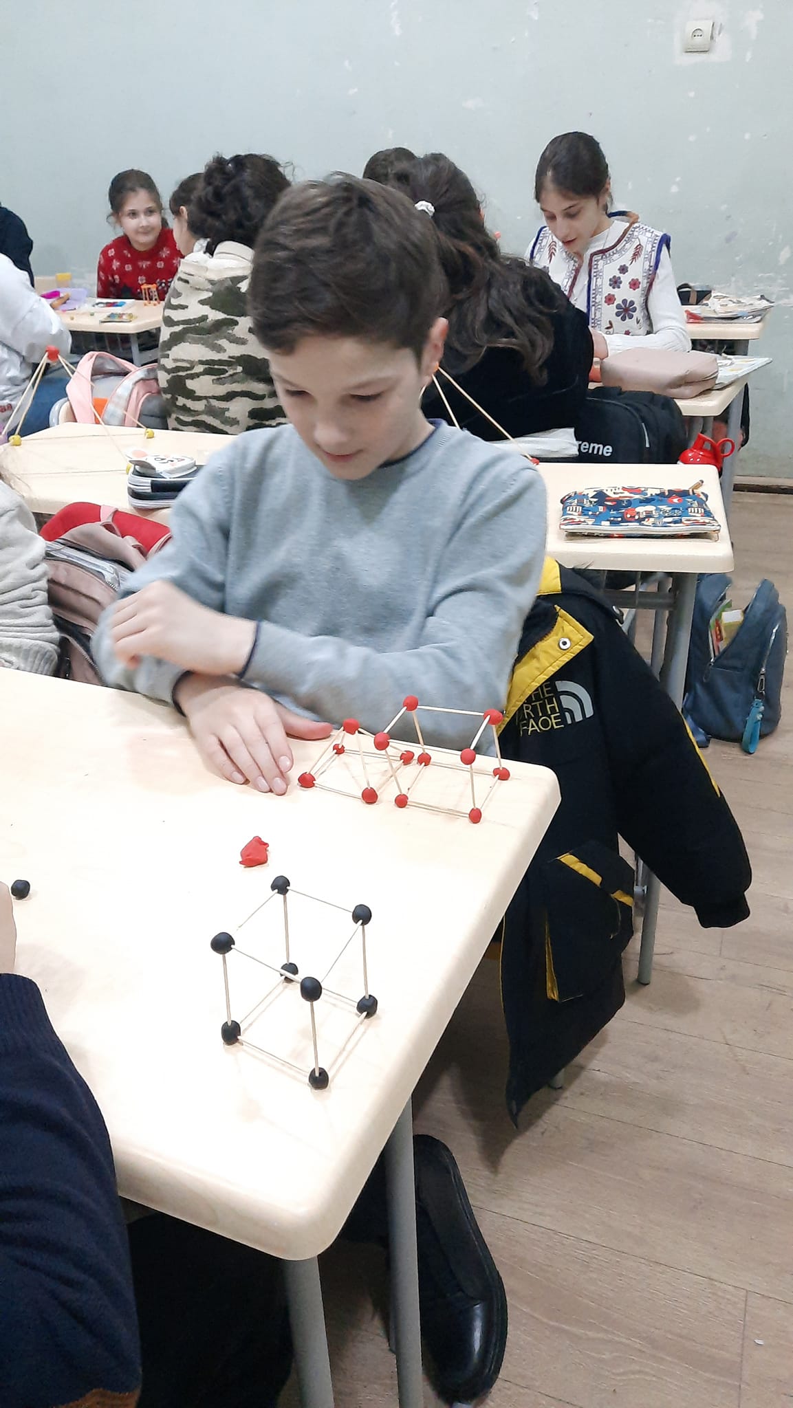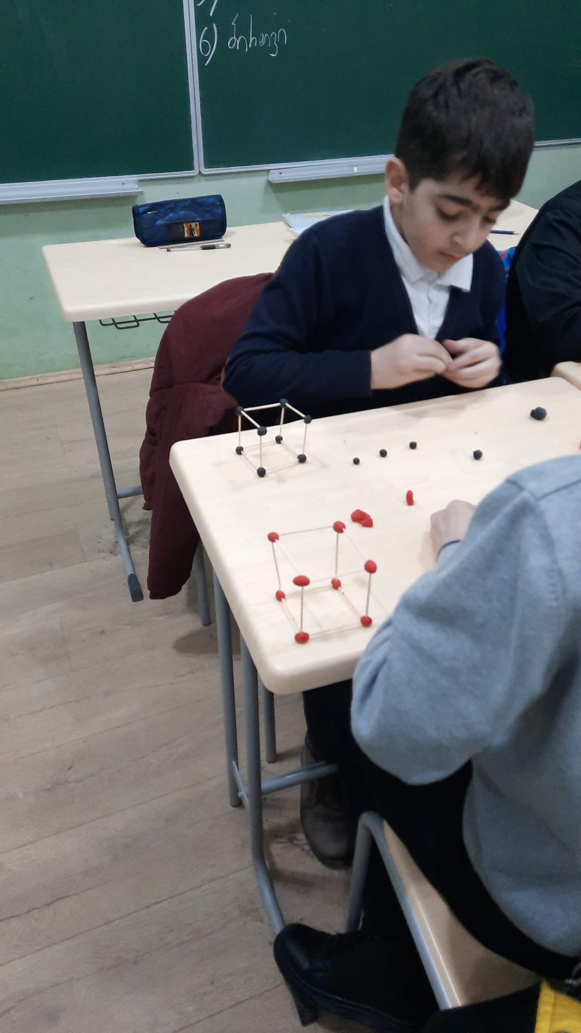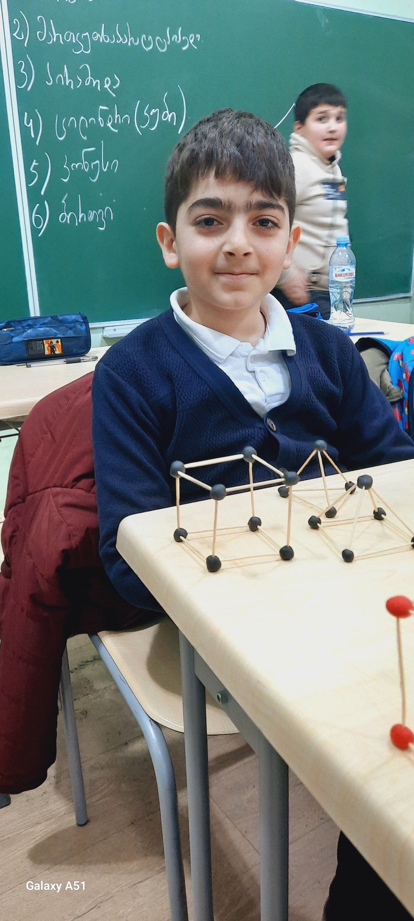 მათემატიკის პედაგოგმა ცირა ბოლქვაძემ ბავშვების მეტი დაინტერესებისა და უკეთ აღქმისათვის, საგაკვეთილო პროცესში გამოიყენა პრაქტიკული მაგალითებით გაჯერებული სივრცითი ფიგურები (რესურსი: პლასტენინი, ჩხირები).